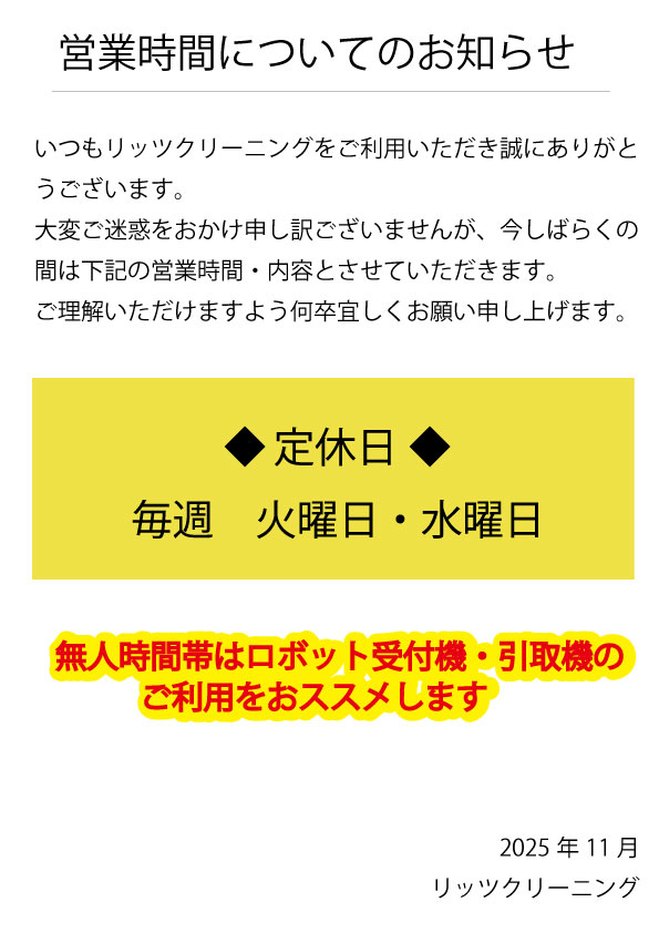 当日仕上げ朝11:00お預り⇒夕方18:00お渡し ※毎週火曜日・水曜日即日仕上げ・仕上り指定停止