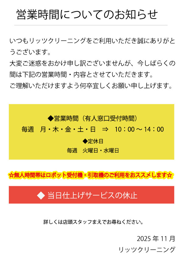 ※ワイシャツの平日サービス価格は日曜日の19時以降~金曜日19時までの窓口受付ならびに受付機ご投函分が対象となります。