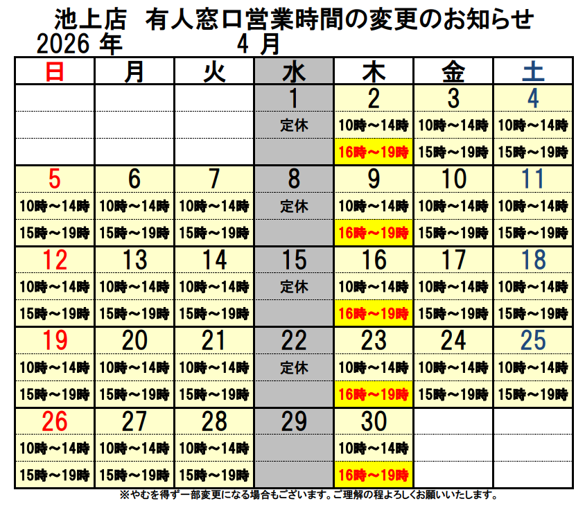 9/2より定休日が毎週火曜日・水曜日となります